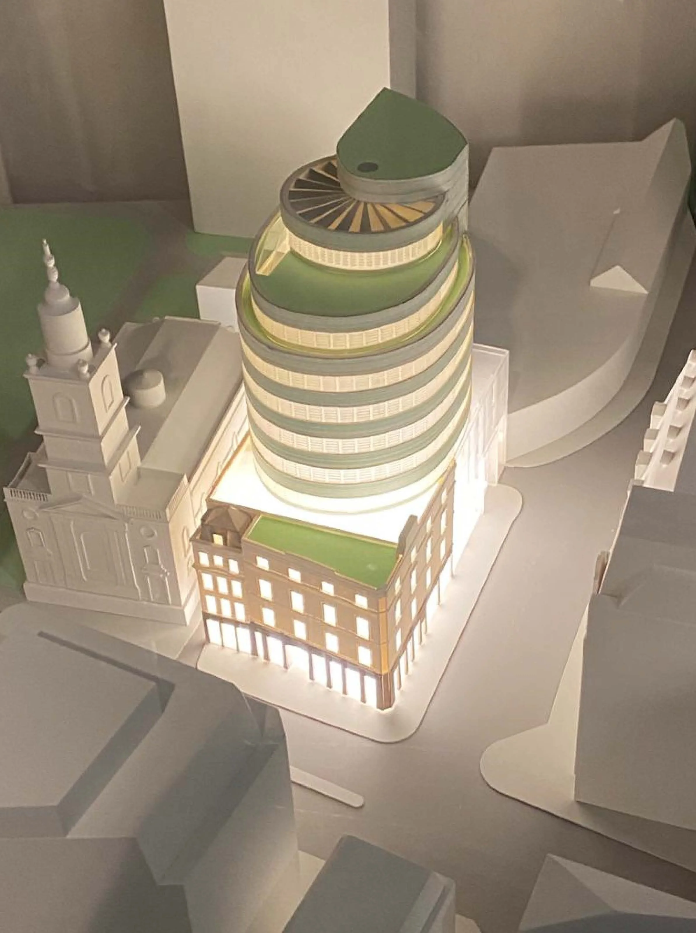 A complete small city block in a prime location in the City of London. The Client considered carefully the possibility of redevelopment of this site. It was the Client’s desire to create a unified scheme which is befitting of the important entry point to the City of London via Liverpool Street to provide high quality retail at ground floor and basement and an iconic small office building to offer identifiable Headquarters accommodation for high profile and medium size companies. The redevelopment of the site created a scheme which rises above the height of the retained façades of the Georgian buildings facing Bishopsgate. From the east and north the building takes on a cylindrical form, the rounded form of the newly constructed scheme, unlike the rectilinear shape of the former Alderman’s House allows the building to be read simply as viewed from each angle. The sculptural form sometimes touching the ground to the south and west disappearing as the building sits back behind the historic façades. The mini tower element plays an important role in long views within the Conservation Area and this part of the City adding interest to the skyline and making key location of the corner of the two routes and by Liverpool Street Station within a wider urban landscape, the site planning and careful use of materials and detailing ensures however that both these elements can be read within the townscape as part of a coherent whole.